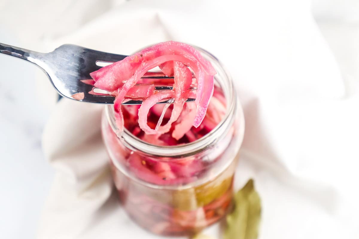Quick pickling, in general, is a flexible process, so it’s easy to make substitutions and work with ingredients you have on hand. I love the flavor and color red wine vinegar gives to the red onions, but other kinds of vinegar produce equally delicious results. I’ve pickled onions with apple cider, white wine, and rice vinegars. While all of these vinegars give great flavor, they won’t give the onions the delightful pink color.